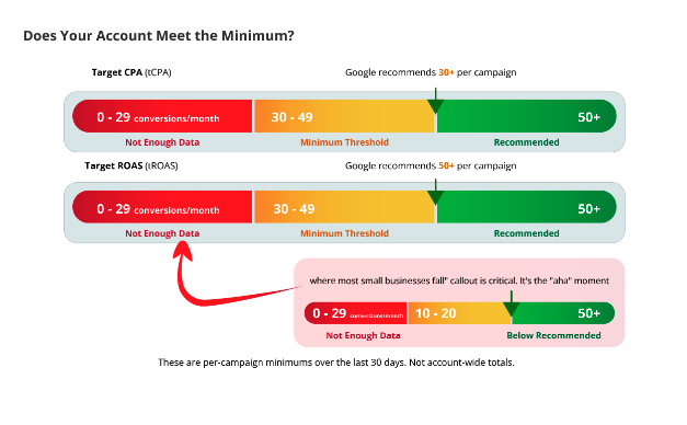 Với Google Ads, chiến dịch sẽ tối ưu tốt hơn khi có nhiều dữ liệu chuyển đổi. Tuy nhiên, ngay cả khi dữ liệu chuyển đổi (conversion data) chưa lớn, hệ thống vẫn có thể tận dụng các auction-time signals (như từ khóa tìm kiếm, thiết bị, vị trí, thời điểm…) để hỗ trợ việc tối ưu. Trong thực tế, nhiều chiến dịch bắt đầu tối ưu ổn định khi có khoảng 30 conversions trong 30 ngày. Lúc đó thuật toán đã có đủ dữ liệu để dự đoán khả năng chuyển đổi của từng lượt tìm kiếm và điều chỉnh giá thầu phù hợp.