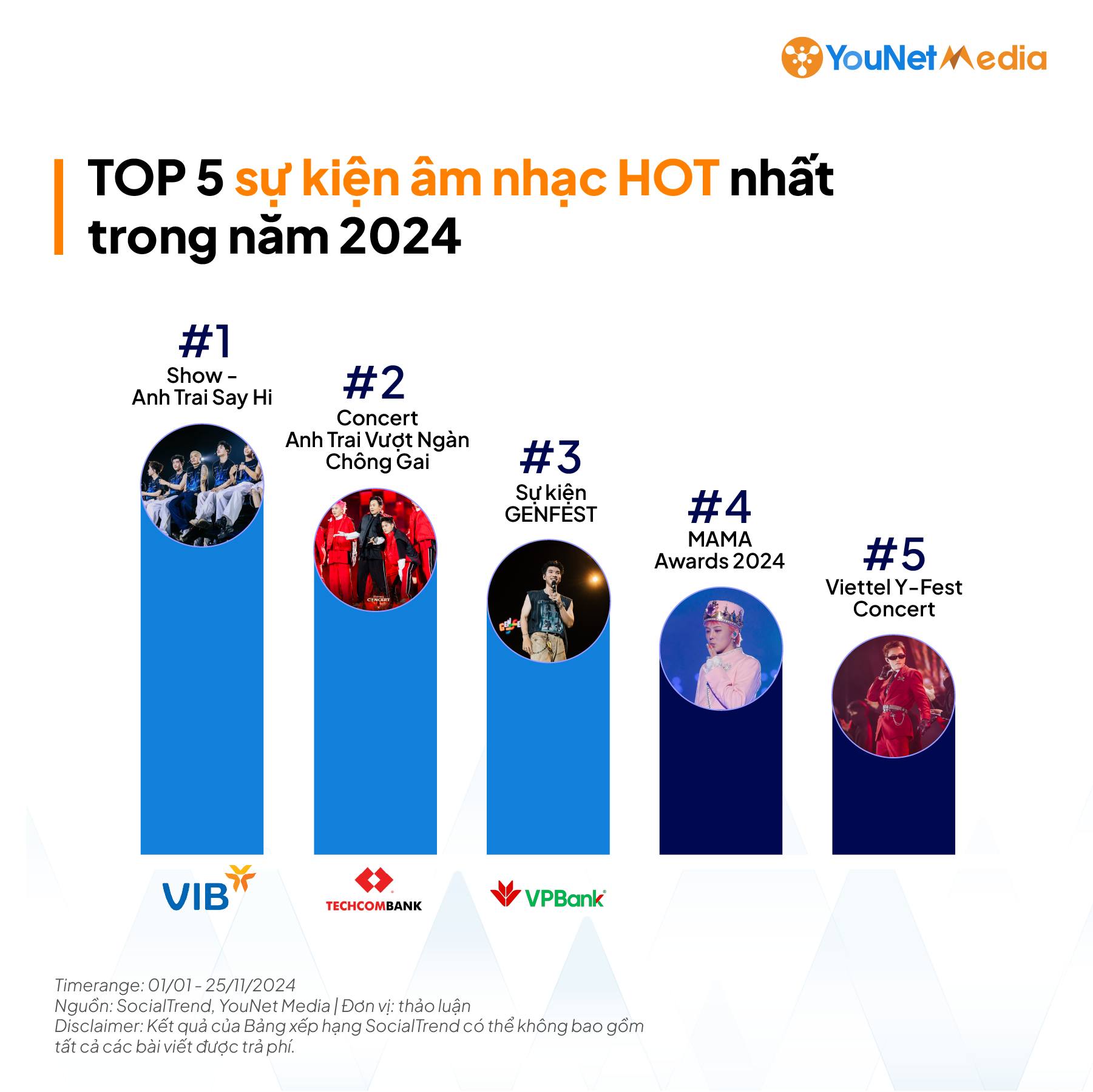 Theo thống kê của YouNet Media từ 30 ngân hàng thương mại cổ phần trong năm 2024, các hoạt động liên quan đến âm nhạc chiếm 40% tổng số sự kiện truyền thông, trong khi thể thao chiếm 34%. Riêng trong mảng âm nhạc, concert và music festival chiếm tỷ trọng cao nhất (24%), theo sau là gameshow (20%).
